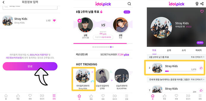 Luego de pulsar el botón de registro, ve al icono de "home" y selecciona a STRAY KIDS en "hot trending"